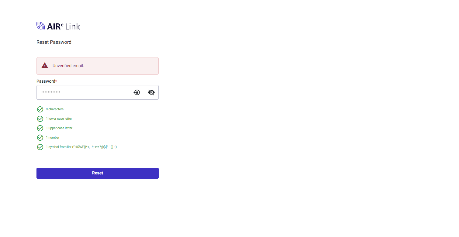 Hello, here the problem is that you are trying to reset password for account/email that was not properly verified. You need to finish the registration procedure first (look in your emails for AIRe Link account activation) and then the reset will work.